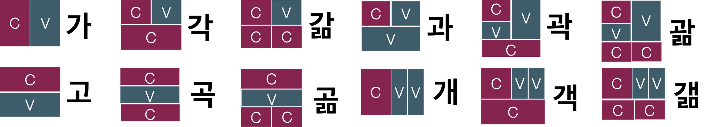 By combining these letters into syllable blocks (gulja), Hangul can form 11,172 possible guljas. Once the consonants and vowels are learned, all guljas can be read without memorizing them individually.